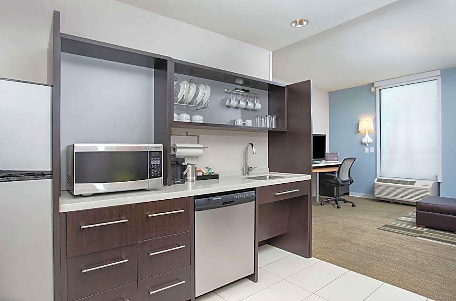 This hearing accessible non-smoking studio suite features one queen-sized bed. The room also has a visual alarm and notification devices for the doorbell or door knock and incoming telephone calls. Our spacious suite features a kitchen including refrigerator, microwave oven, dishwasher, flatware, microwavable cookware, coffeemaker and toaster. Induction burner cook tops are available free to check out at the front desk. Our living area features an HDTV that can be watched from anywhere in the suite. Also included is a queen-sized sofa bed and work desk. When you're ready for bed, relax on our Serta Suite Dreams bed with luxurious micro-fiber sheets. All bedding, including the bedspread, is washed clean for every guest. Enjoy complimentary WiFi and wireless printing. Any corresponding photo may not reflect the specific accessible room type or room feature.
